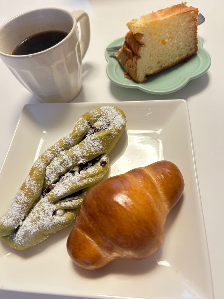 焼き立てバターロール、ノエルツリー、丹沢シフォンケーキ、コーヒー。